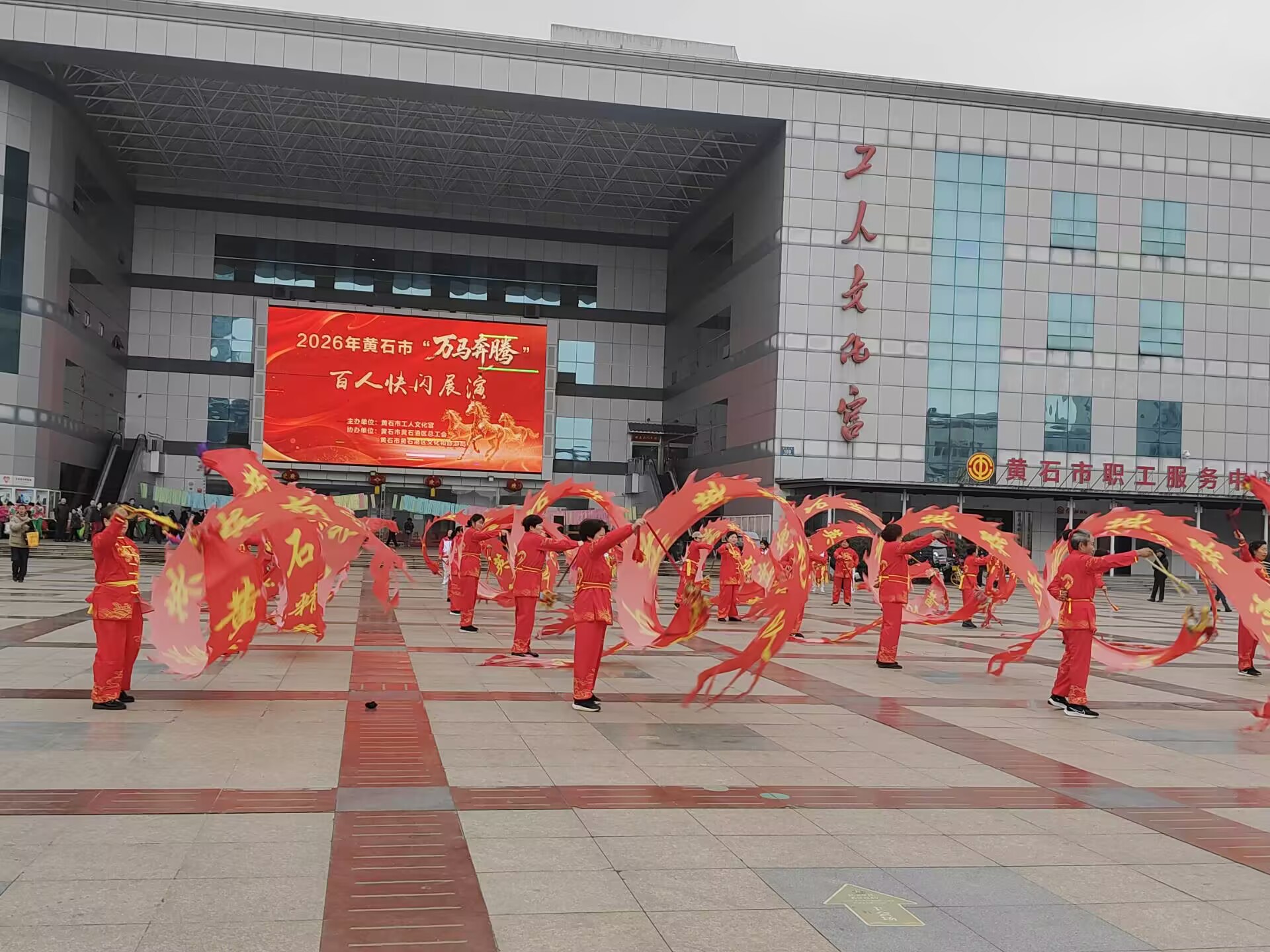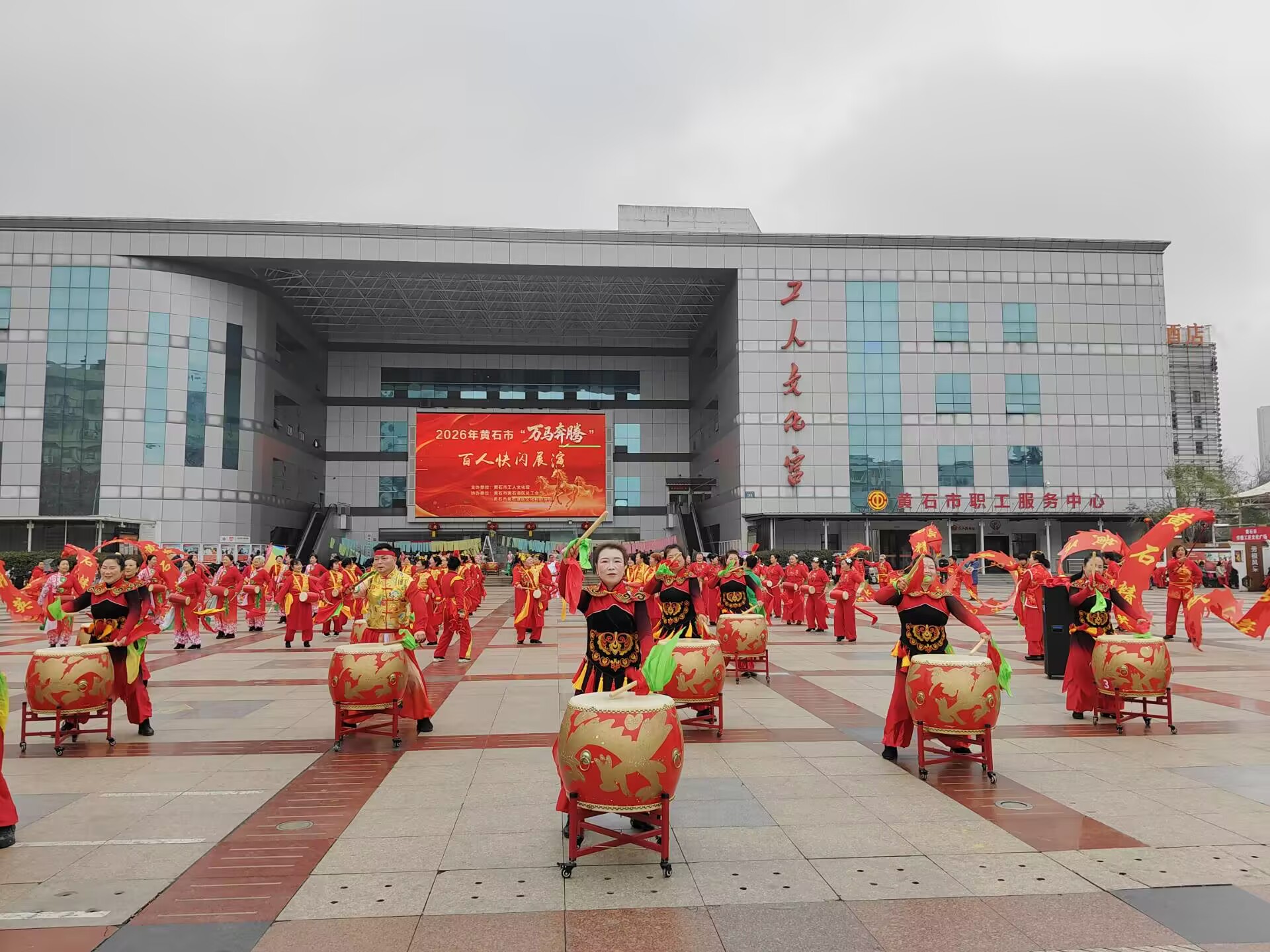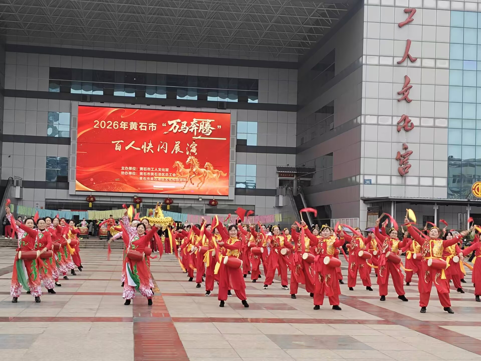 3月3日元宵节当天上午,黄石港区文化馆选送中国鼓、腰鼓等节目参加由黄石市工人文化宫主办,黄石港区总工会、黄石港区文化和旅游局承办的2026年黄石市“万马奔腾”百人快闪展演活动。此次快闪活动在黄石工人文化宫广场举办,现场约110名民俗文化爱好者同台,呈现出元宵的热闹氛围。